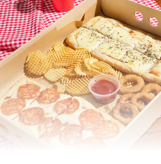 MIX PRZEKĄSEK: Popcorn, Nachosy, Precelki, Orzeszki, Kabanosy, Kubełek warzyw sezonowych, Owoce sezonowe, Tortilla pełnioziarnista ze strpsami z kurczaka, Nuggetsy z kurczaka, Hot- dogi; Grissini otulone szynką prosciutto, ser pleśniowy, salsa pomidorowa